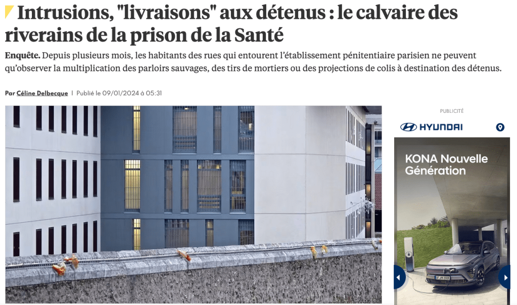 Article sur le site de l’Express du 9 janvier 2024 9 janvier 202415 février 2024riverainsdelasante https://www.lexpress.fr/societe/intrusions-livraisons-aux-detenus-le-calvaire-des-riverains-de-la-prison-de-la-sante-WWA2DHN5YNCMNHXNQ4DYJ3BURA Partager : Cliquer pour partager sur X(ouvre dans une nouvelle fenêtre) X Cliquez pour partager sur Facebook(ouvre dans une nouvelle fenêtre) Facebook J’aime chargement…